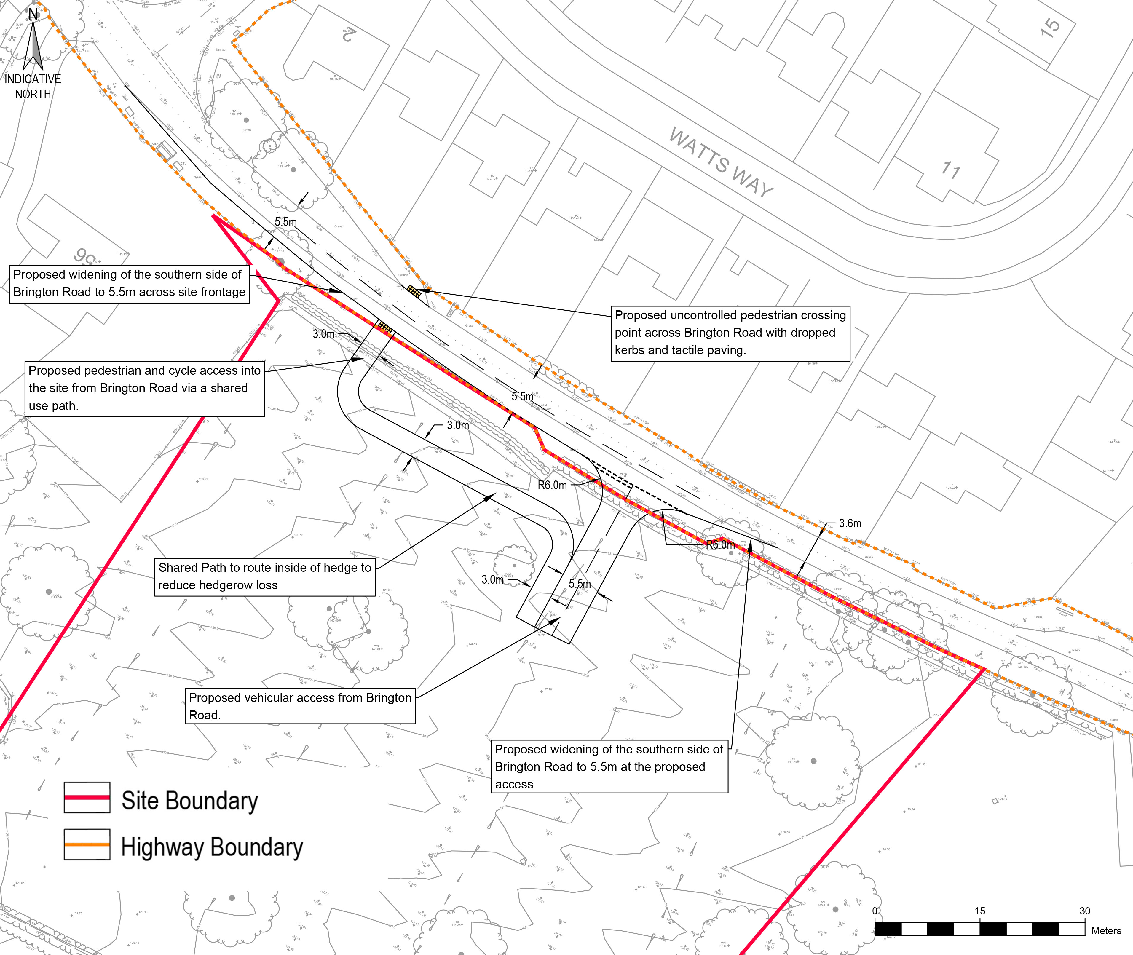 Vehicular access to the proposed development will be provided via a new priority ‘give way’ junction on Brington Road. The access road will be 5.5 metres wide, with 6-metre radii at the entrance to accommodate turning vehicles. To improve movement along Brington Road itself, the carriageway will be widened to 5.5 metres along the site frontage, allowing two large vehicles to pass safely and efficiently.