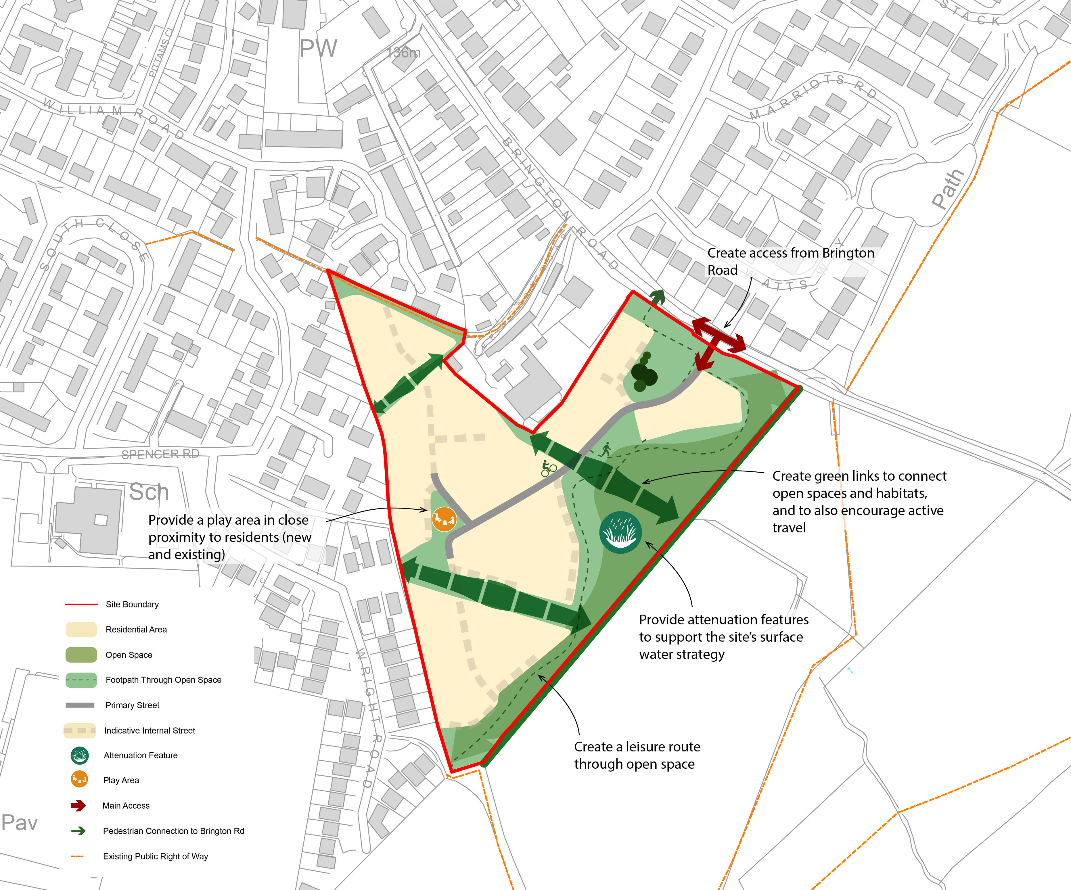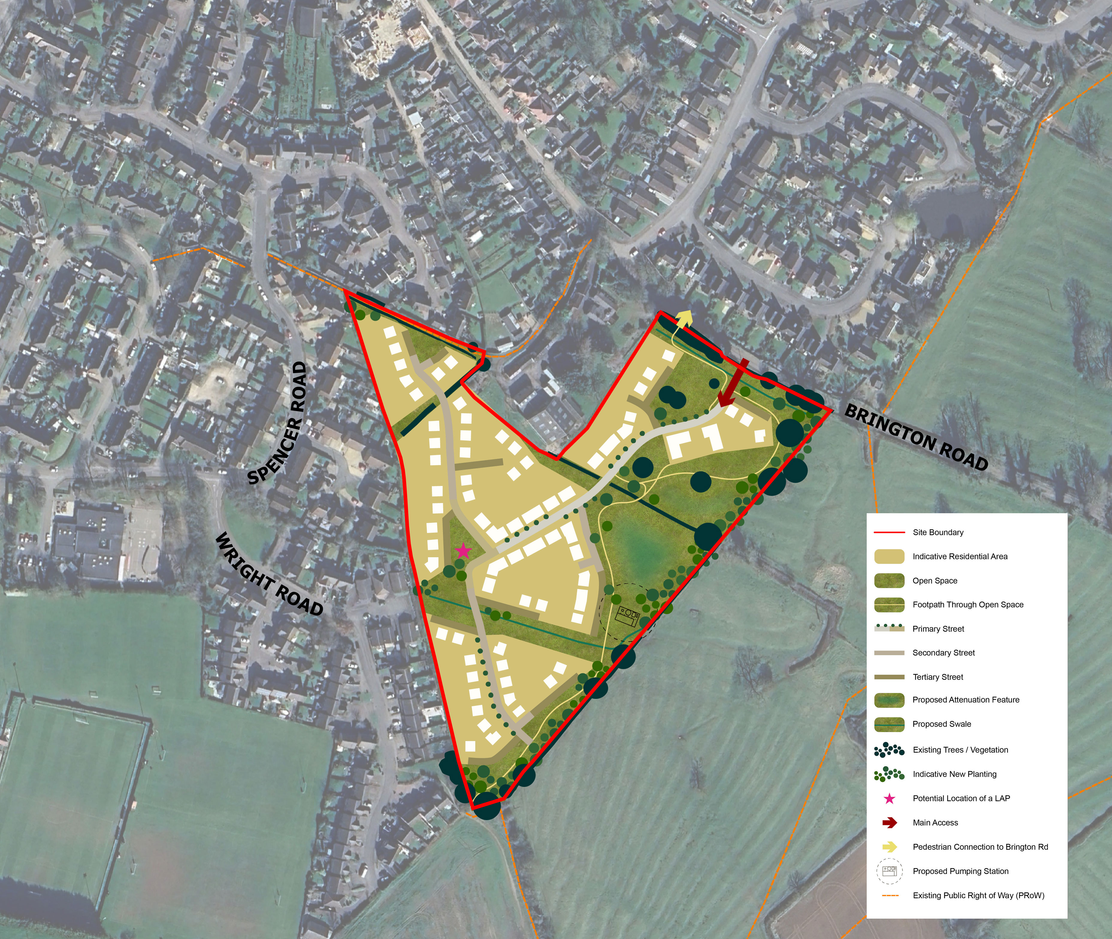 Access to the site for vehicles is proposed via a new junction on Brington Road, on the northern edge of the site. The access will be designed to accommodate all necessary vehicle types and will include measures to support safe and convenient movement for pedestrians and cyclists.
